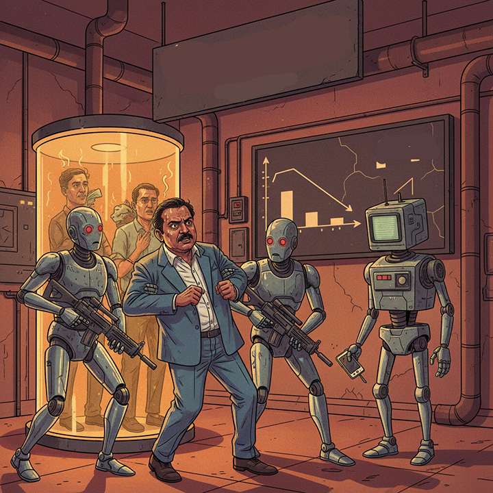 দুই মিনিট না যেতেই দুটো অস্ত্রধারী রোবট এসে ধরে নিয়ে গেল ত্রিনিকে। তাকে রাখা হলো বিশেষ আমজনতা চেম্বারে। পৌষের গরমে সেদ্ধ হচ্ছেন ত্রিনি। ‘ঘটনা কী!’ প্রশ্নটা দশবার করেও উত্তর পাননি। খানিক পর কৃবু এলো। তাকে দেখেই চেঁচিয়ে উঠলেন।